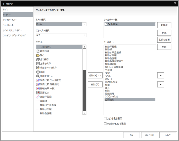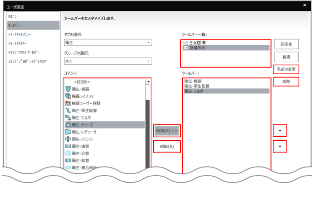 [ツールバー]の一覧から目的のコマンドを選択し、[▲][▼](移動)ボタンをクリックします。 - コマンドを削除するには