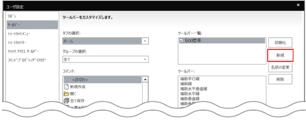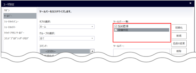 [ツールバー]の一覧から目的のコマンドを選択し、[削除]ボタンをクリックします。削除したコマンドは、[コマンド]の一覧から選択し直すことができます。 - ツールバーの名前を変更するには