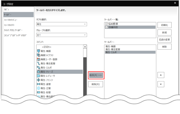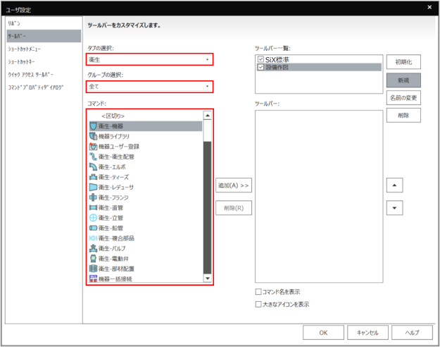 クリックすると、[コマンド]の一覧で選択しているコマンドが[ツールバー]に追加されます。 |