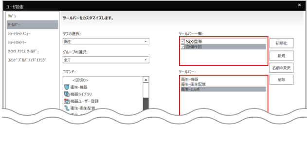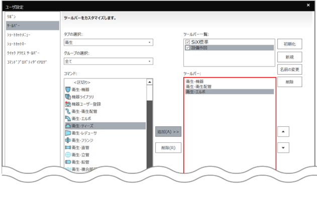 コマンドの追加、移動、削除、またはツールバーの名前の変更を行います。