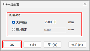 配置する高さを[天井高さ]または[高さ指定]から選択し、[OK]ボタンをクリックします。