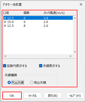 一括配置するアネモ名称を選択して、指定した空調区画に対する[風量]を入力し、[OK]ボタンをクリックします。