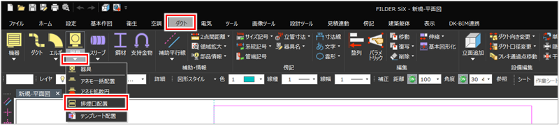 [ダクト]タブの[器具]プルダウンメニューから[排煙口配置](