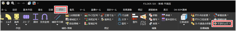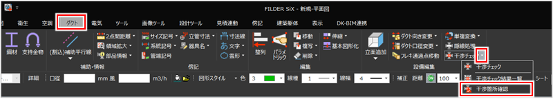 [ダクト]タブの[干渉チェック]プルダウンメニューから[干渉箇所確認]コマンド(