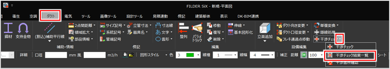 [ダクト]タブの[干渉チェック]プルダウンメニューから[干渉チェック結果一覧]コマンド(