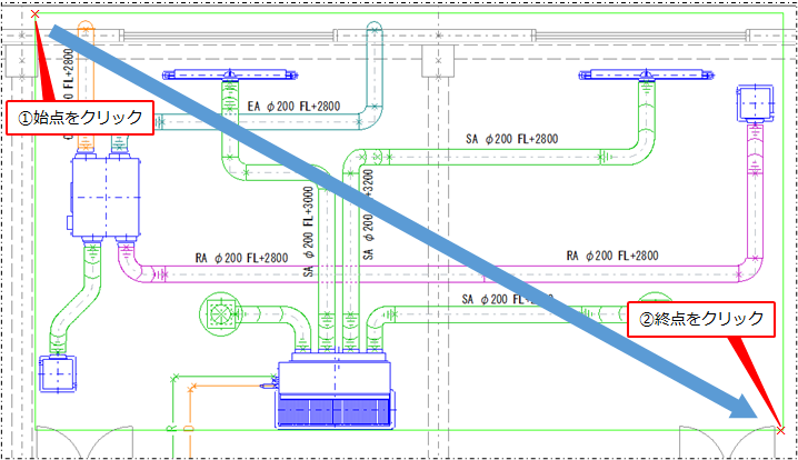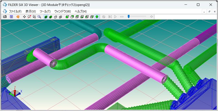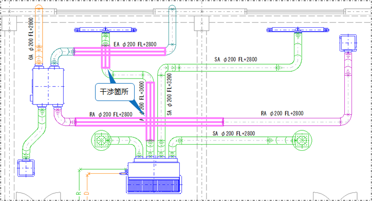 図面上に、配管、ダクト、躯体(柱・壁・梁)の部品の重なり(干渉)が発生しているかをチェックします。