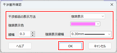 干渉部品を囲む線幅を入力します。入力した線幅は[強調表示線幅]に登録され、次回から[強調表示線幅]で選択できます。 |