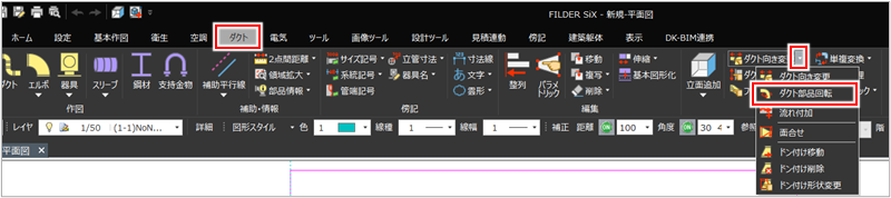 [ダクト]タブの[ダクト向き変更]プルダウンメニューから[ダクト部品回転]コマンド(