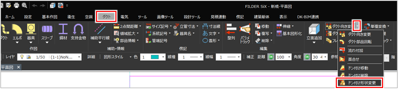 [ダクト]タブの[ダクト向き変更]プルダウンメニューから[ドン付け形状変更]コマンド(