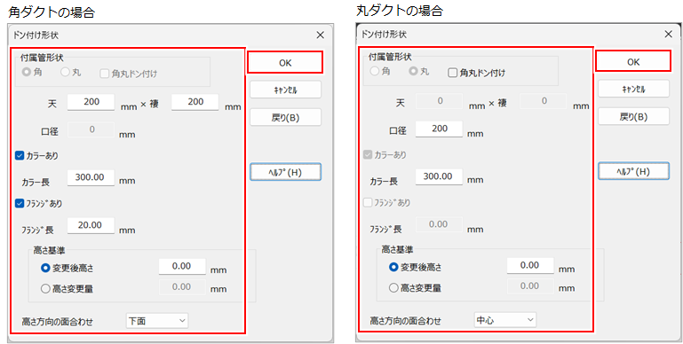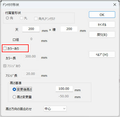 丸ダクトの場合は、角丸ドン付けのときにチェックを付けます。 角ダクトの場合は、本項目は変更できません。 |