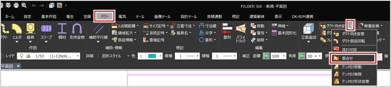[ダクト]タブの[ダクト向き変更]プルダウンメニューから[面合せ]コマンド(