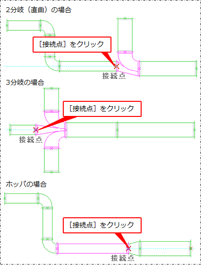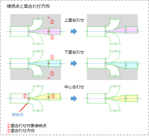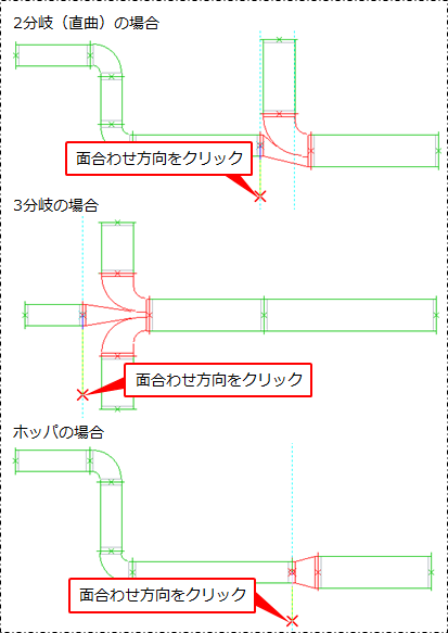 クリックした接続点を基準として、面合わせ方向に指定した側にダクト面がそろえられます。ただし、2方分岐(直曲)・3方分岐の入口側は面合わせの対象となりません。