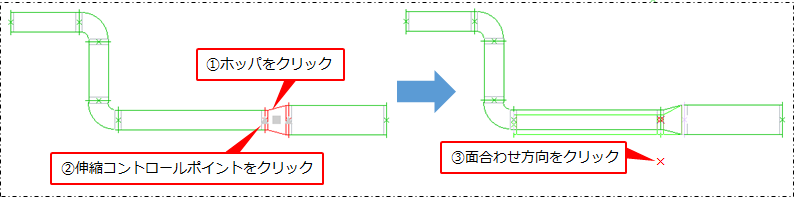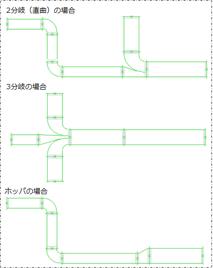 2分岐(直曲)・3方分岐、ホッパのダクトの面合わせを変更します。面合わせによる接続点の移動にともなって、接続しているダクト部品が移動・伸縮処理されます。
