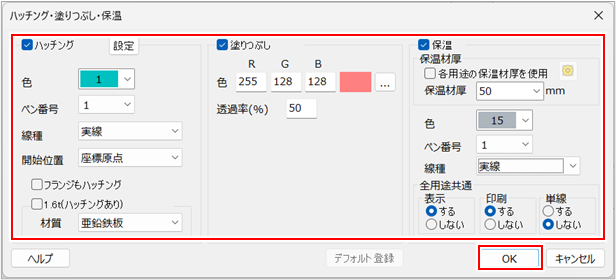 ハッチング・塗りつぶし・保温表示を設定し、[OK]ボタンをクリックします。