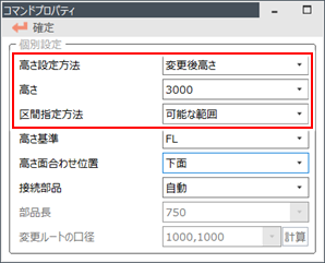 [高さ設定方法]から[変更後高さ]、[区間指定方法]から[可能な範囲]を選択し、[高さ]に変更する高さを入力します。