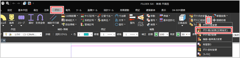 [ダクト]タブの[ダクト口径変更]プルダウンメニューから[ダクト高さ変更]コマンド(