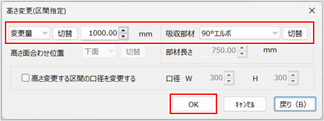 ここでは、例として[変更量]に「1000」を入力し、[吸収部材]で[90°エルボ]を選択します。
