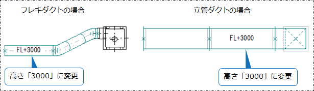 フレキなどの高さ吸収部材または立管ダクトで高さを吸収して高さ変更する場合フレキなどの高さ吸収部材または立管ダクトで高さを吸収して高さ変更する場合