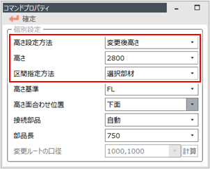 [高さ設定方法]から[変更後高さ]、[区間指定方法]から[選択部材]を選択し、[高さ]に変更する高さを入力します。