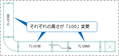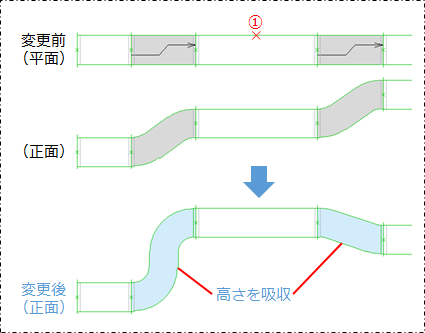 同一系統のダクトの高さを変更します。高さを変更する区間の端部に接続部品が追加され、前後のダクトとの接続が保持されます。