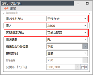 [高さ設定方法]から[干渉チェック]、[区間指定方法]から[可能な範囲]を選択します。