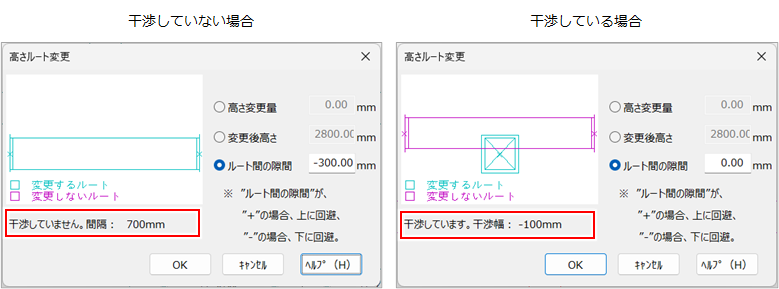 [高さルート変更]ダイアログに干渉結果が表示されます。