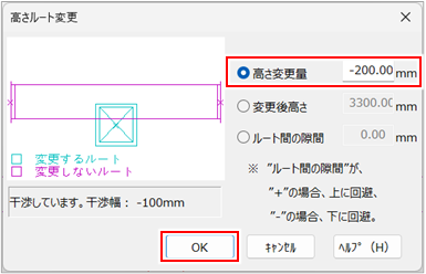 [高さ変更量][変更後高さ][ルート間の隙間]のいずれかを選択し、[OK]ボタンをクリックします。