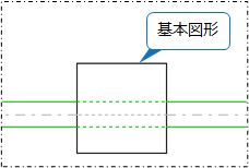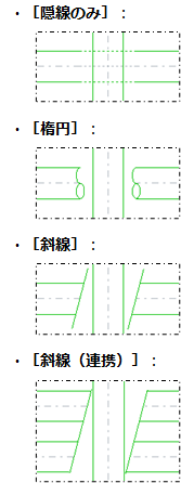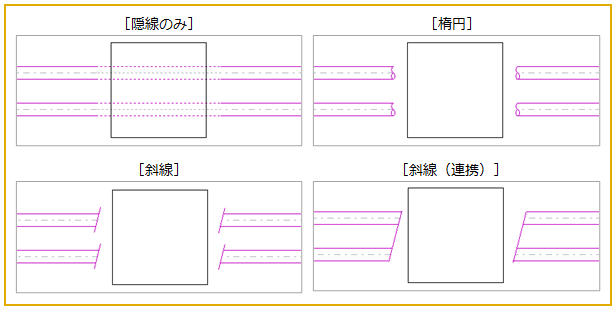 [コマンドプロパティ]の[隠線形状]で選択した管端記号により、以下のように表示されます。