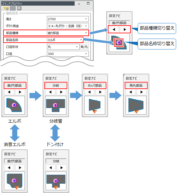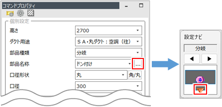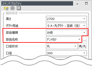 [コマンドプロパティ]で[部品種類][部品名称]の設定を変更します。