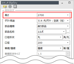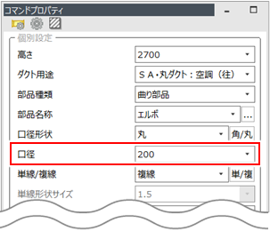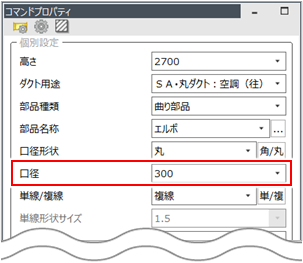 丸ダクト作図の途中で[コマンドプロパティ]や共通項目ツールバーから口径や高さを変更して作図します。