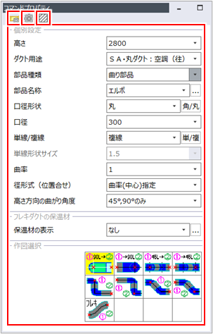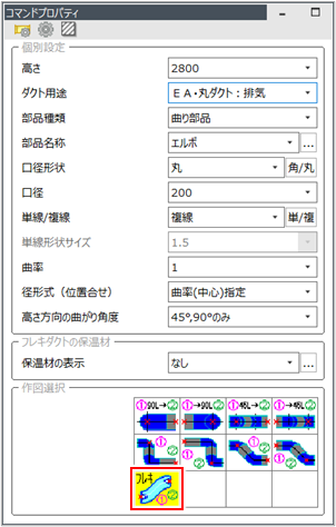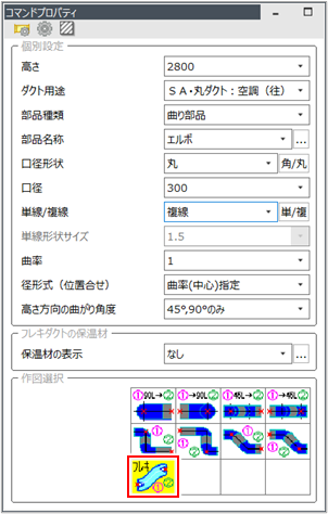 フレキダクトを作図する場合は、[コマンドプロパティ]の[作図選択]で[フレキ]を選択します。