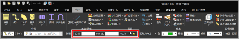 丸ダクトの作図時は、丸ダクトメジャーに口径を計算する計算尺を表示して口径を変更できます。