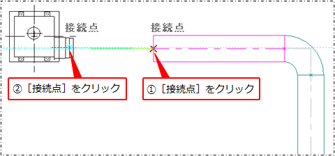 丸ダクト・機器にマウスを近づけて[接続点]と表示されるポイントでクリックします。