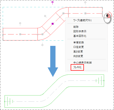 作図済みの直管ダクトをフレキダクトに変更する場合は、直管ダクトやエルボを選択し、右クリックして表示されるメニューの[フレキ化]をクリックします。