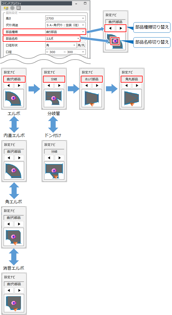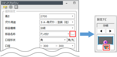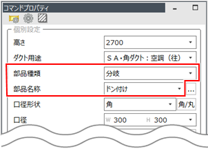 [コマンドプロパティ]で[部品種類][部品名称]の設定を変更します。
