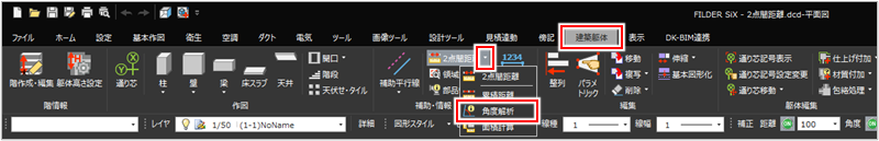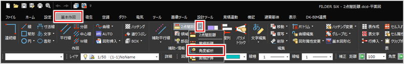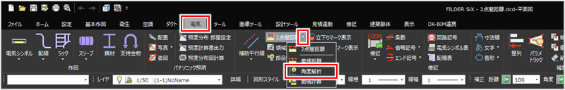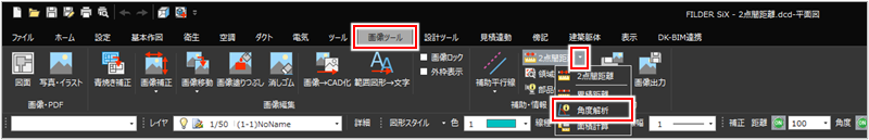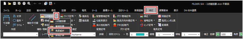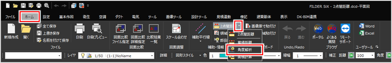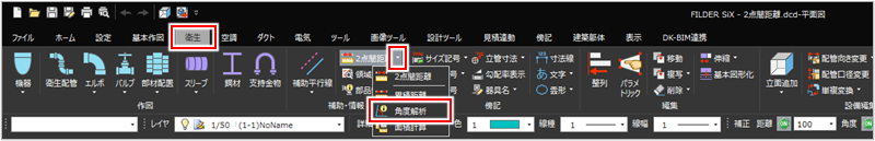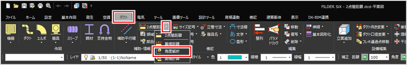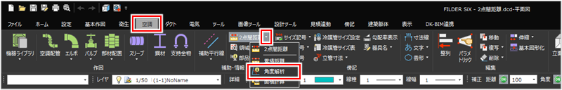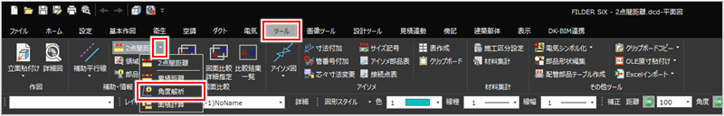 [ホーム]タブ>[2点間距離]プルダウンメニュー>[角度解析] [基本作図]タブ>[2点間距離]プルダウンメニュー>[角度解析] [衛生]タブ>[2点間距離]プルダウンメニュー>[角度解析] [空調]タブ>[2点間距離]プルダウンメニュー>[角度解析] [ダクト]タブ>[2点間距離]プルダウンメニュー>[角度解析] [電気]タブ>[2点間距離]プルダウンメニュー>[角度解析] [ツール]タブ>[2点間距離]プルダウンメニュー>[角度解析] [画像ツール]タブ>[2点間距離]プルダウンメニュー>[角度解析] [設計ツール]タブ>[2点間距離]プルダウンメニュー>[角度解析] [傍記]タブ>[2点間距離]プルダウンメニュー>[角度解析] [建築躯体]タブ>[2点間距離]プルダウンメニュー>[角度解析] |