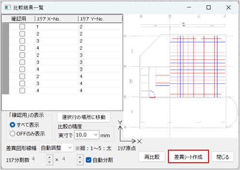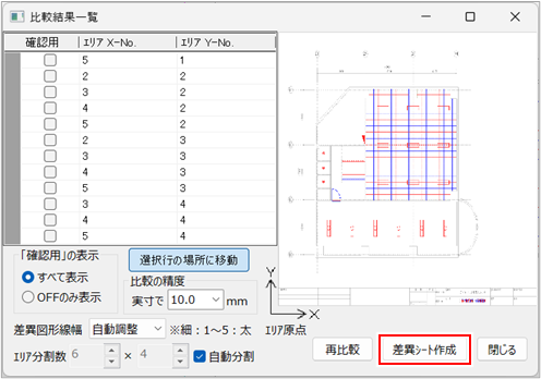 比較結果図面に差異シートを作成する場合にクリックします。 |