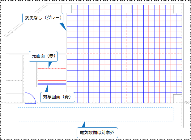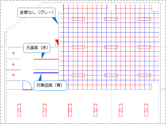 比較結果図面は、元図面の図形が赤色、対象図面の図形が青、変更がない図形はグレーで表示されます。