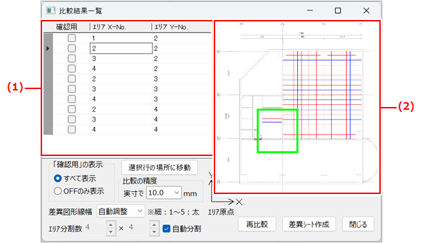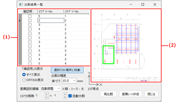 比較結果図面を複数エリアに区切り、差異があったエリアのみ[比較結果一覧]ダイアログの結果一覧に番号が表示されます。エリア番号をクリックすると、右側のプレビューでクリックした番号のエリアが黄緑色の枠で囲まれます。