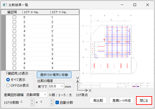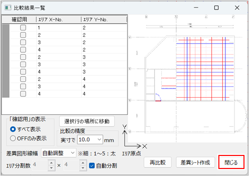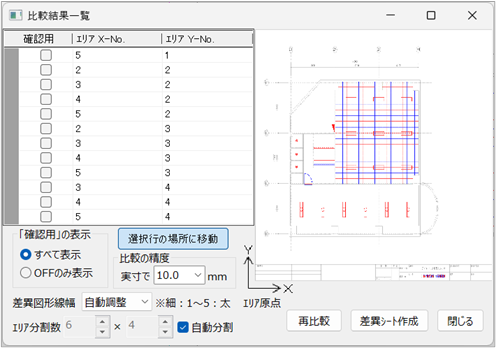 図面の修正後やエリア分割数の変更後に再比較を実行する場合にクリックします。 |