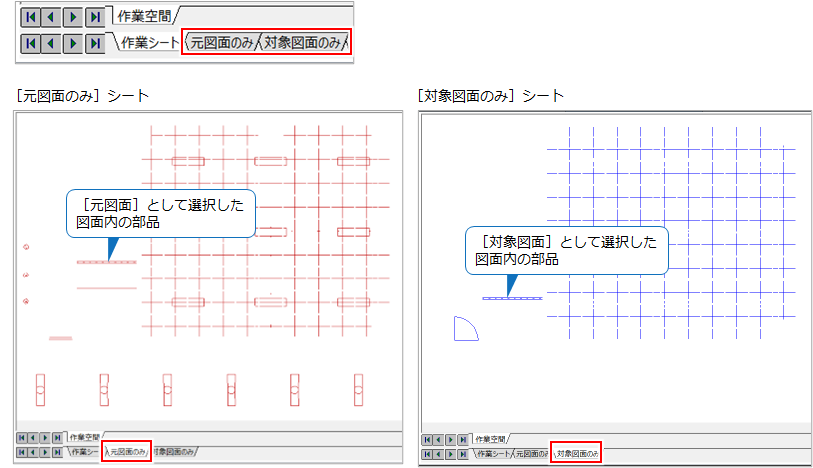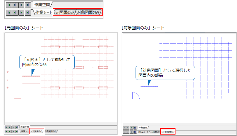 [元図面のみ][対象図面のみ]の2つのシートが作成されます。シートの状態を変更することで、差異図形のみ確認できます。