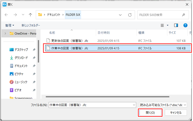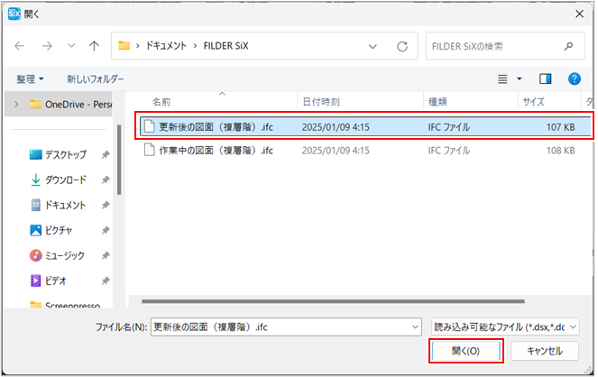 比較元の図面(IFC形式ファイル)を指定し、[開く]ボタンをクリックします。