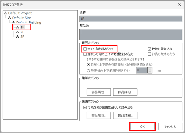 比較するフロアを指定する場合は、右側の[範囲オプション]の[全ての階を読み込む]のチェックを外し、左側のフロア一覧から読み込むフロアを選択します。