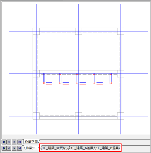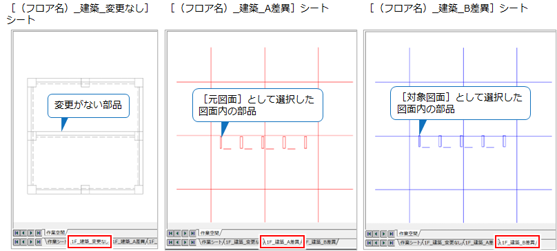 比較処理の完了後、新規図面に[(選択したフロア名)_建築_変更なし][(選択したフロア名)_A差異][(選択したフロア名)_建築_B差異]の3つのシートが自動作成されます。