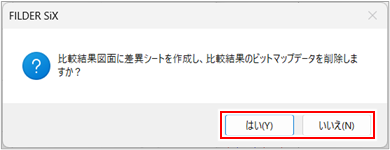元図面をFILDER SiXで開いていない場合は、確認ダイアログが表示されます。[はい]をクリックすると、差異シートの作成が開始されます。[いいえ]をクリックすると、差異シートは作成されません。 元図面にも差異シートを作成したい場合は[いいえ]を選択し、[比較結果一覧]ダイアログを閉じてください。