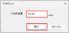 干渉とみなす最短距離(保温材の厚みなど、部材同士が近づいてもよい最小距離)を[干渉許容差]に入力し、[実行]ボタンをクリックします。