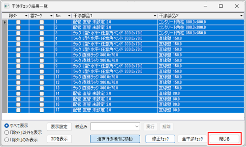 干渉チェック結果を確認したら、[閉じる]ボタンをクリックします。