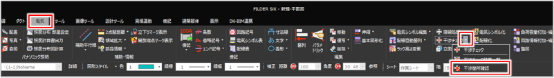 図面の強調表示を解除するには、[電気]タブの[干渉チェック]プルダウンメニューから[干渉箇所確認]コマンド(