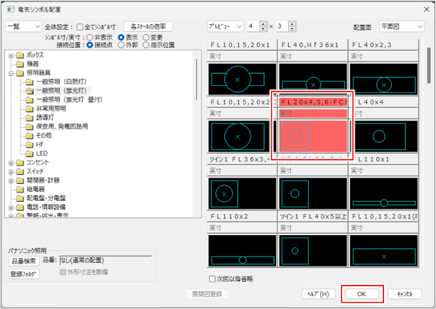 [電気シンボル配置]ダイアログが表示されるので、置き換えるシンボルを選択します。 |