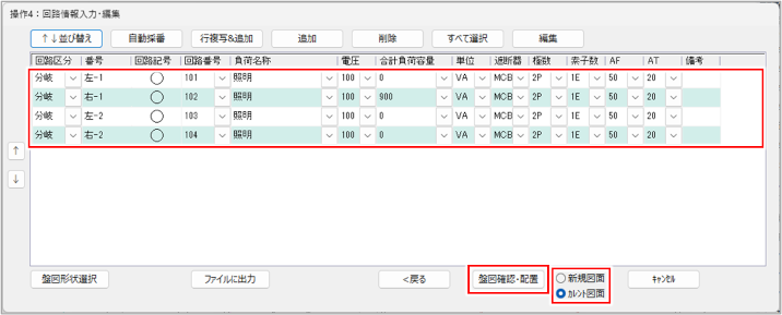 回路情報を編集して、[新規図面]または[カレント図面]を選択し、[盤図確認・配置]ボタンをクリックします。
